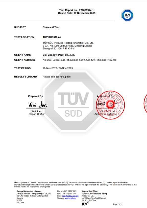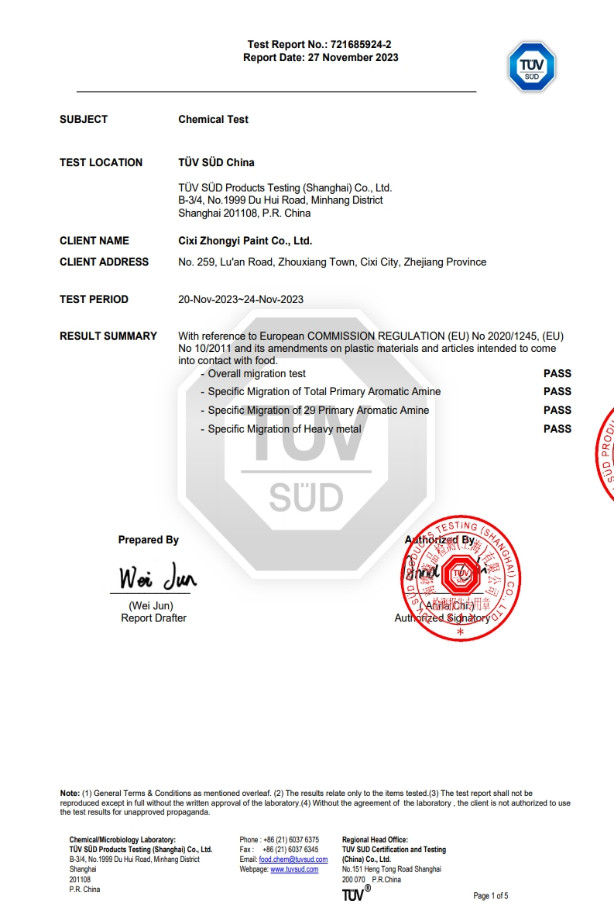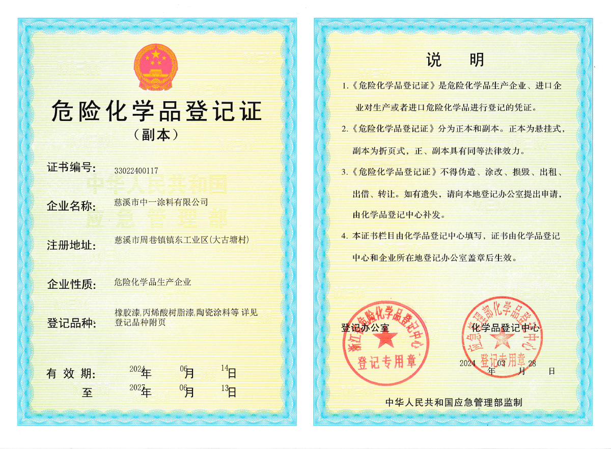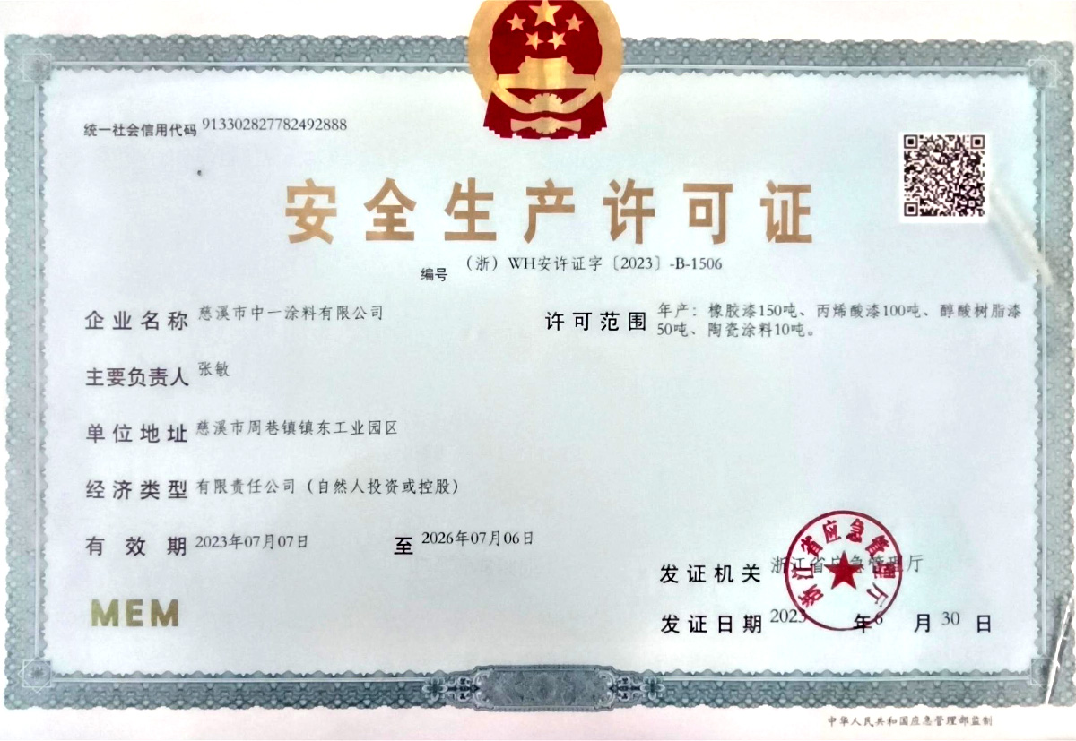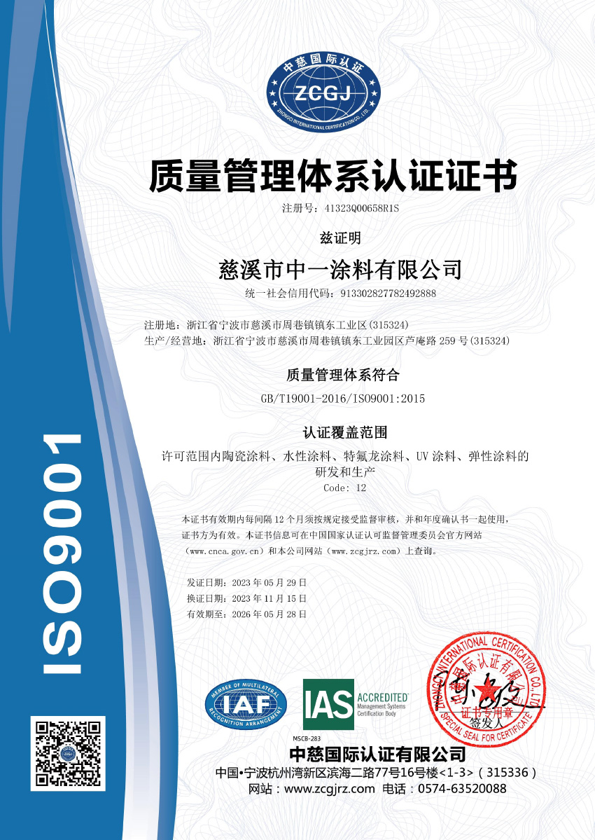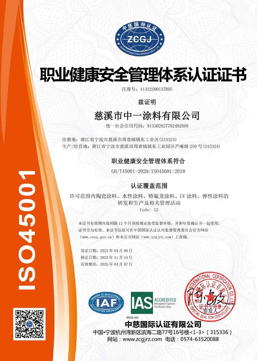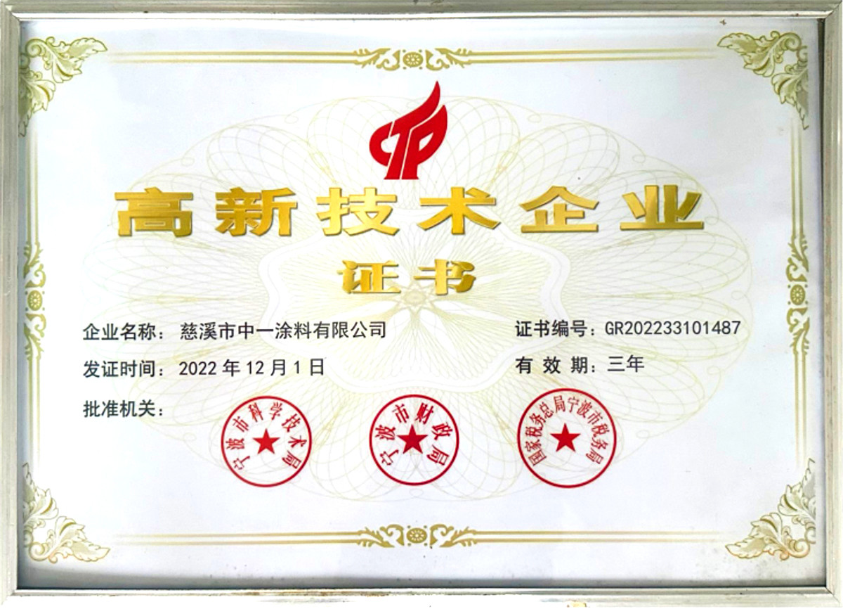 慈溪市中一涂料有限公司位于沈海高速与329国道交界处,毗邻余姚塑料之乡、模具之城、全国家电百强镇,具有得天独厚的地理位置。公司成立于2003年,是专业研发、生产单层/双层/多层水性特氟龙涂料、聚醚砜涂料、有机硅涂料、纳米陶瓷涂料、丙烯酸等等工业涂料的科技型企业,公司竭尽为顾客设计环保、健康、多彩、满足各种底材的高性能涂料方案,追求持续为客户创造更大价值。公司占地面积13200平方米,总投资一亿余元,拥有先进的德国进口砂磨机、高速分散机、快速球磨机、真空搅拌机等涂料加工设备,各种涂料年产能约5000吨,年总产值近1.5亿余元。