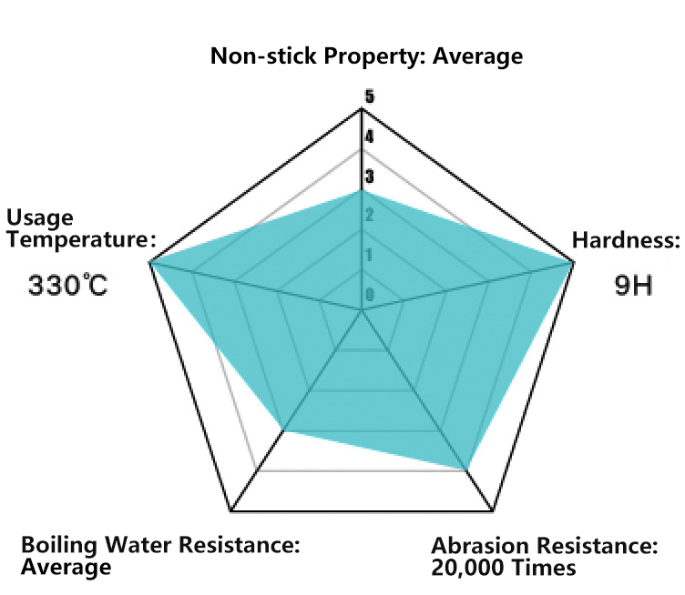 Water-based nano-ceramic coating is a "zero fluorine" coating, environmentally friendly and safe. It exhibits excellent chemical stability, outstanding acid and alkali resistance, and wear resistance of approximately 20,000 cycles. Its hardness is impressive, reaching 9H, and it can withstand 96 hours of salt spray corrosion. It can endure temperatures as high as 600ºC for short periods and can be used continuously at temperatures exceeding 330ºC. The surface finish of this coating is comparable to enamel, with exquisite colors and a silky-smooth texture. Under light refraction, it presents a dazzling visual effect akin to that of agate.