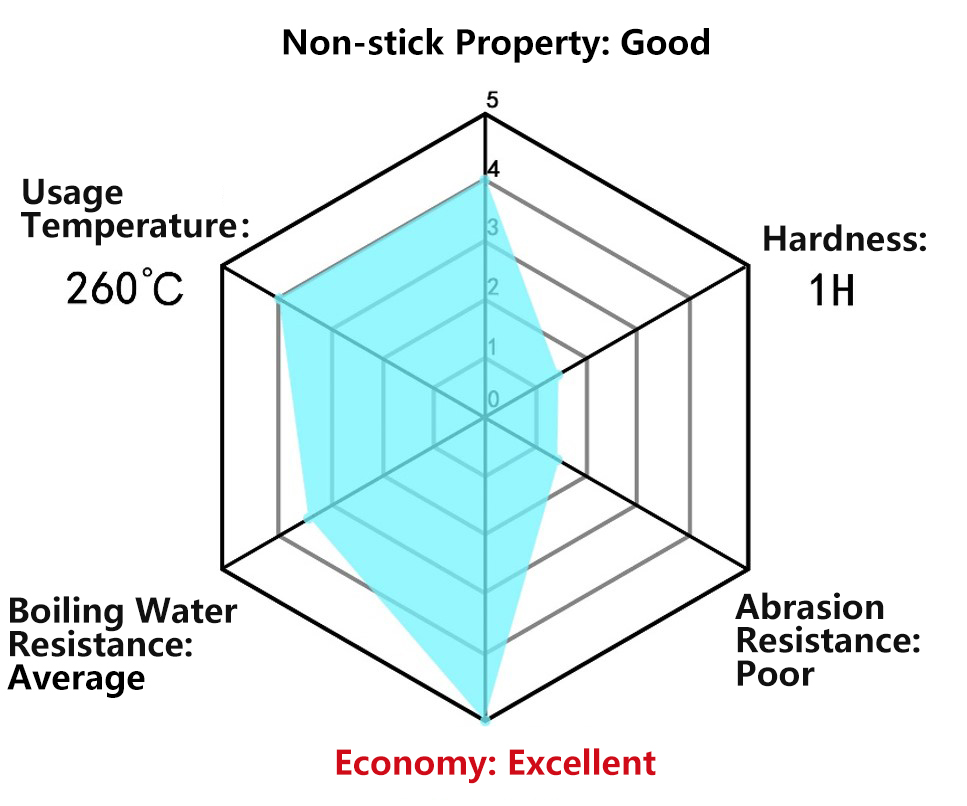 This coating demonstrates excellent non-stick properties and can operate stably over a long period in the temperature range of 230 to 260°C, withstanding temperatures as high as 320°C for short periods. Although its performance in hardness, wear resistance, and boiling resistance is average, it offers very high economic efficiency, providing users with a cost-effective solution.